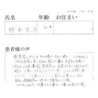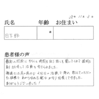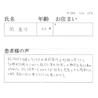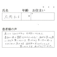 最初の頃は、実感できなかったのですが、施術を受ける度にどんどん楽になっていき、思っていたより早く治して頂いて、とてもうれしく思っています。