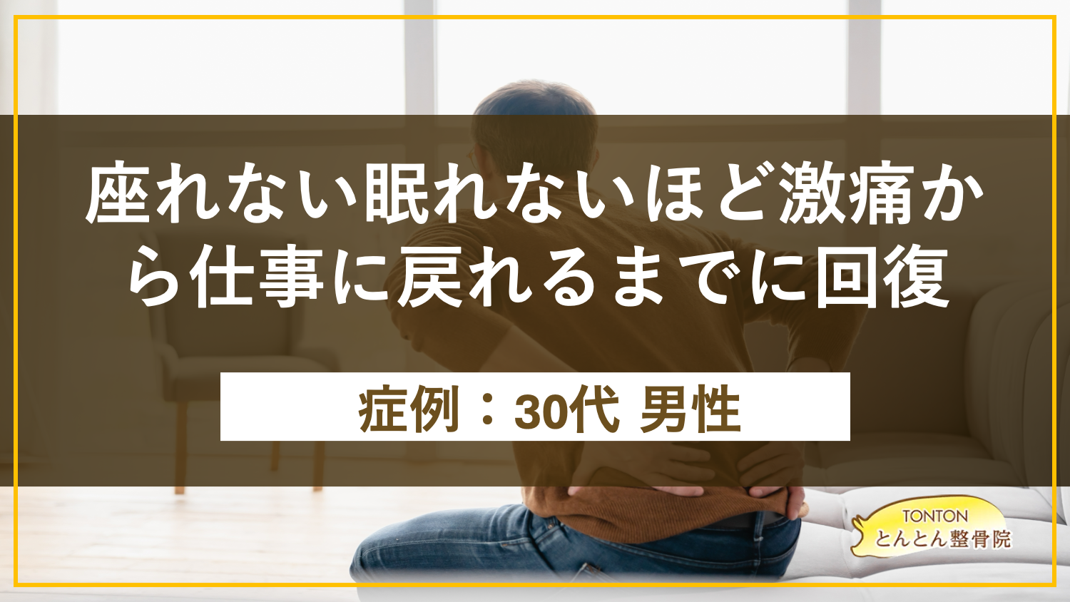 ※当院に来院前に病院で「腰椎椎間板ヘルニア」の診断済み ・悪化する動作や場面:歩行、座位、臥位 ・日常生活で困っていたこと:座っていられない、眠れない ・これまでの対処:痛み止め服用、ブロック注射 ・来院時の痛みスコア(NRS):8