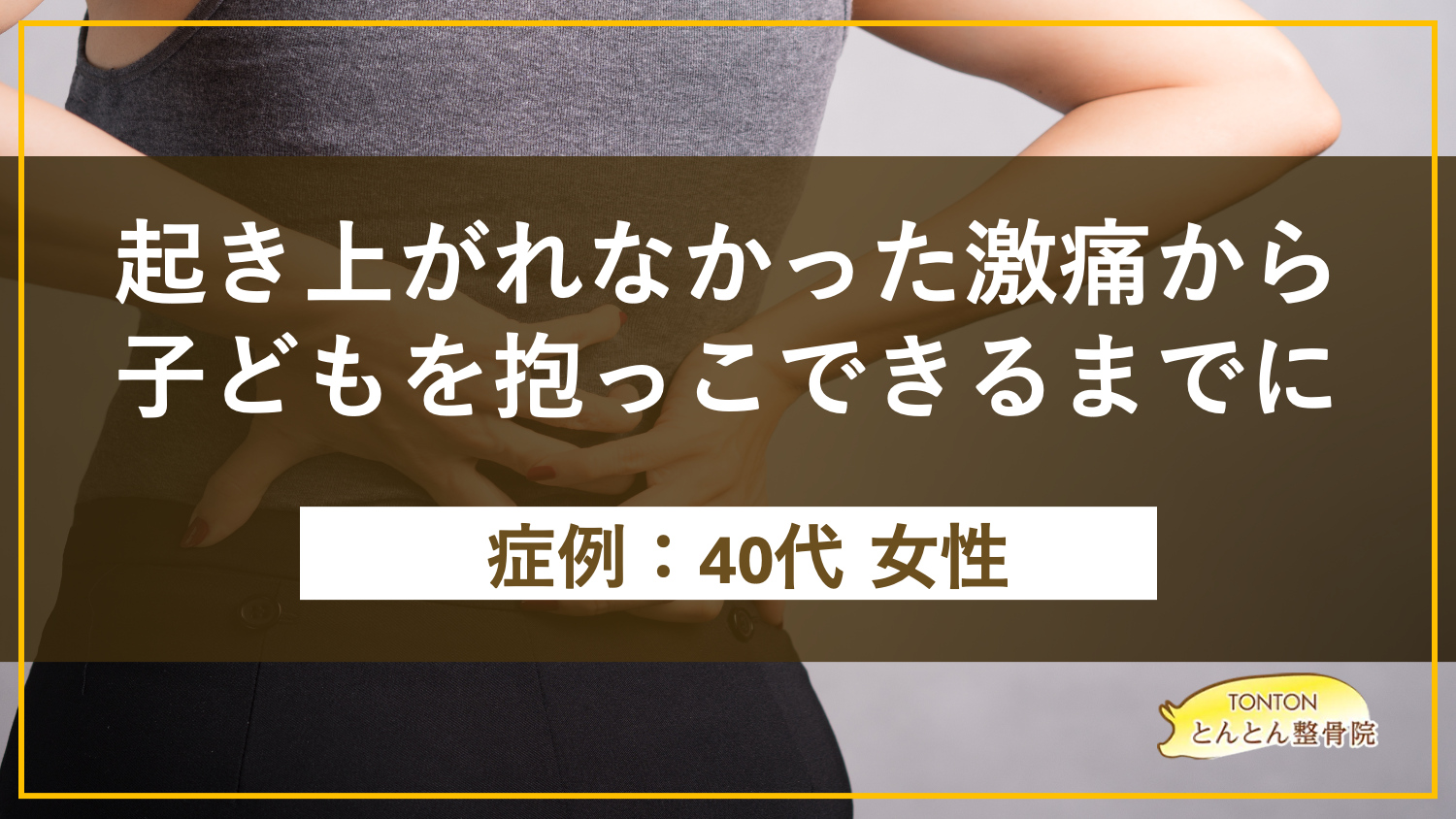 こちらの患者様は主婦で幼稚園のお子さんがいらっしゃり普段は抱っこをする機会も多い方です。10/28に痛みが出始め、だんだん痛みが強くなってきて、朝は起き上がる動作や座っている状態でも辛く生活に支障がでている状態でした。 当院にいらっしゃる前に整形外科に2ヶ所行き「腰椎椎間板ヘルニア」と言われ、注射と湿布や痛み止めを処方されていましたが、痛みや痺れが変わらない状況でした。 痛みや痺れがかなり強くなってきたため当院へ来院されました。 来院時の痛みスケールは10段階中10でした。